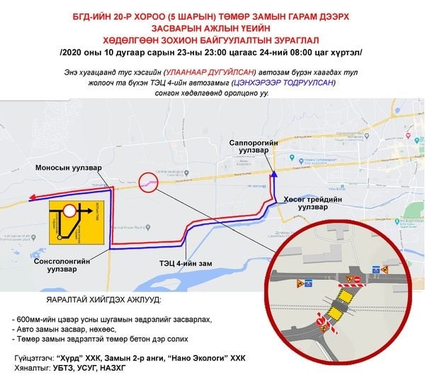Иймээс жолооч та бүхэн тухайн замаар зорчилгүй, Саппорогийн тойрог, Хөсөг трэйдийн уулзвар, Эрчим хүчний гудамж буюу ТЭЦ-4-ийн зам, Сонсголонгийн уулзвар, Моносын уулзвар гэсэн замыг сонгон хөдөлгөөнд оролцоно уу.