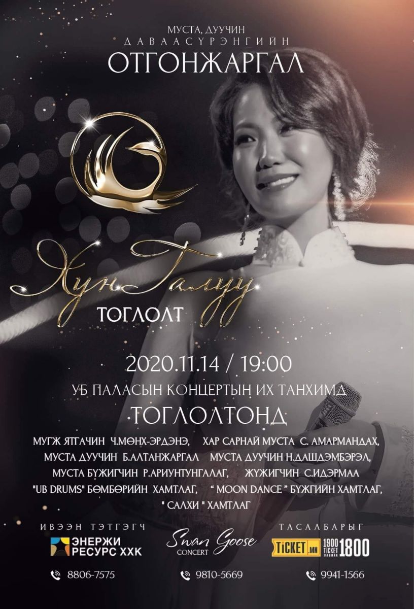 Тэгвэл эрхэм дуучин маань сонсогч түмэндээ "Хун галуу" хэмээх уран бүтээлийн тоглолтоороо бэлэг барихаар бэлтгэл ажлаа хангасаар байна. Тэрбээр ирэх арваннэгдүгээр сарын 14-нд 19:00 цагаас Улаанбаатар паласын концертын их танхимд ганцхан удаа тоглохоор тов тогтоожээ. Түүний уран бүтээлийн цэнгүүнд Гавьяат жүжигчин, ятгачин Ч.Мөнх-Эрдэнэ, Соёлын тэргүүний ажилтан, "Хар сарнай"-н С.Амармандах, Соёлын тэргүүний ажилтан, дуучин Б.Алтанжаргал, жүжигчин И.Идэрмаа, "UB DRUMS" бөмбөрийн хамтлаг, "Салхи" хамтлаг, бүжгийн "UB dance" зэрэг хамтлаг, дуучид оролцоно.