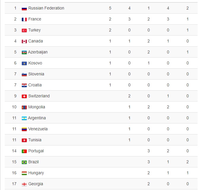 Хүчирхэг бүрэлдэхүүнтэй ирсэн ОХУ-ын баг таван алт, дөрвөн мөнгө, 1 хүрэл медальтайгаар багийн дүнгээр тэргүүлж, Франц (2 – 3 – 2), Туркийн баг (2 – 0 – 0) удааллаа. Нийт 24 орны тамирчид медаль авсан дотор Канад, Азербайжан, Косова, Хорват, Словений жүдочид тус бүр нэг алтан медаль хүртжээ. Манай шигшээ баг 1 мөнгө, 2 хүрэл медаль, 2 шагналт байртайгаар 10 дугаар байрт жагслаа.