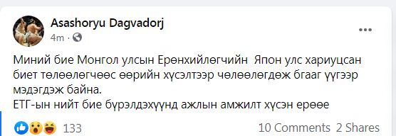 Мэргэжлийн сумо бөхийн их аварга Асашёорюү Д.Дагвадорж Монгол Улсын Ерөнхийлөгчийн Япон улс хариуцсан бие төлөөлөгчөөс өөрийн хүсэлтээр чөлөөлөгджээ.