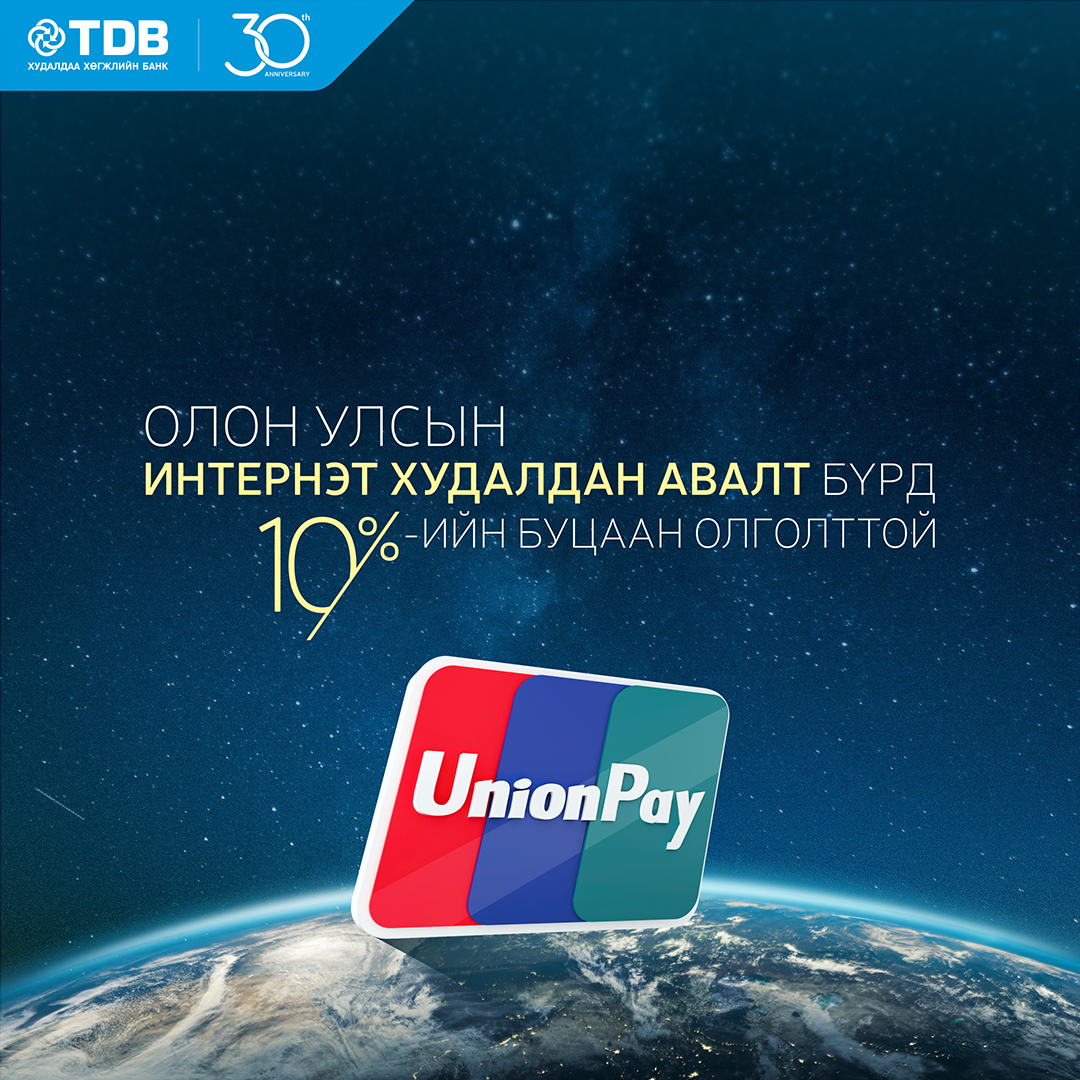 Харин ХХБ-ны UnionPay картаар хийсэн ОУ-ын интернет худалдан авалт бүрийнхээ 10%-ийг буцаан авах урамшуулалт хөтөлбөр зарлагдсан байгаа учир яг одоо ONLINE-р картаа үүсгэж, худалдан авалт бүрээ UnionPay картаараа хийгээрэй.
