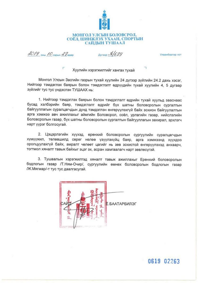 Боловсрол, соёл, шинжлэх ухаан, спортын сайдын 2019 оны 10 дугаар сарын 28 ны А/689 тоот тушаалаар дээрх баярыг тэмдэглэхгүй байх үүргийг бүх шатны сургалтын байгууллагын удирдлагад өгсөн. Боловсрол, шинжлэх ухааны яамнаас тушаалыг мөрдөж ажиллахыг сануулж байна.