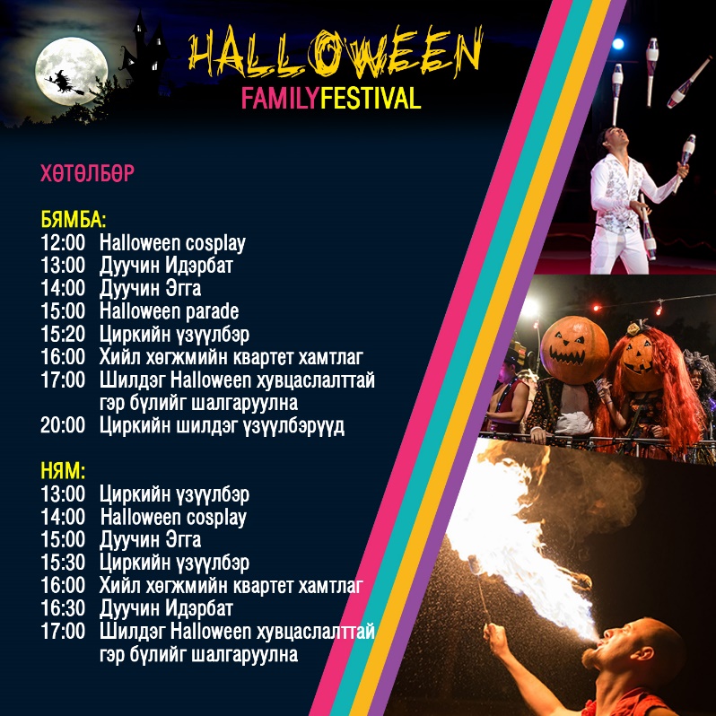Бямба, Ням гарагийн 17:00 цагаас шилдэг Halloween хувцаслалттай гэр бүл, найзуудыг шалгаруулах уралдааны шалгаруулалт болох тул та энэхүү уралдаанд идэвхитэй оролцож шагналын эзэн болоорой.