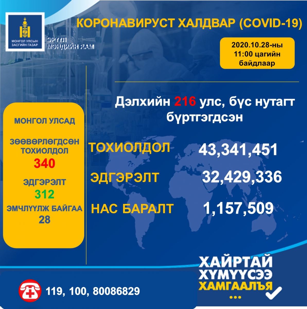 Монгол Улсад коронавирусний халдварын 340 тохиолдол батлагдсанаас 312 нь эдгэрсэн талаар ХӨСҮТ-ийн ерөнхий захирал Д.Нямхүү мэдээллээ. ХӨСҮТ-д одоо 28 хүн эмчлүүлж байгаагийн наймынх нь биеийн байдал хүндэвтэр байгаа аж. ХӨСҮТ-д нийт 54 хүн эмчилгээ, ажиглалт, тандалтад байгаа юм.