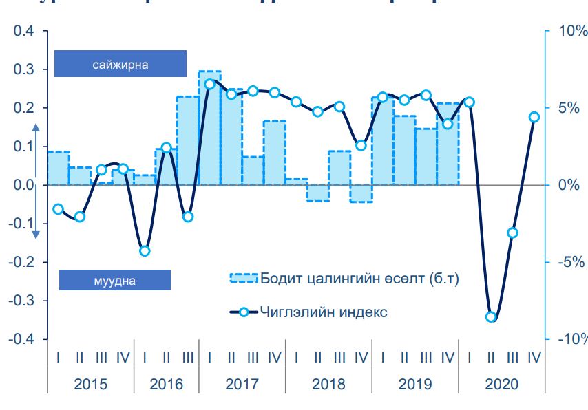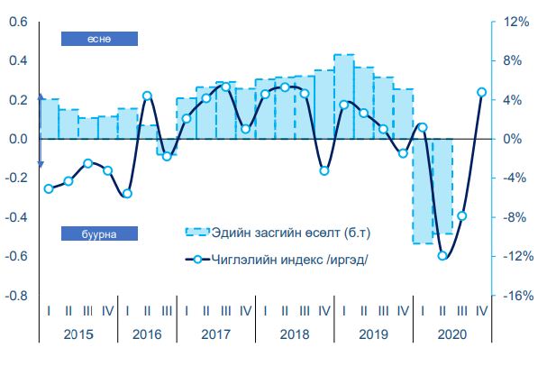 Төв банкны Судалгаа, статистикийн газраас 2020 оны IV улиралд явуулсан түүвэр судалгааны дүнгээр эдийн засгийн чиглэлийн индекс өмнөх улирлын судалгааны дүнгээс сайжирч ирэх нэг жилийн хугацаанд “эдийн засгийн өсөлт өснө” гэсэн мужид гарсан байна.