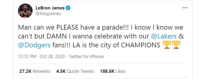ЛеБрон твиттер дээр “Парад, парад, парад! Амны хаалттай аюулгүй жагсаал хийе. Хоёр баг хамтдаа ялалтын парад хийж болохгүй юу? Цар тахлын үед болохгүй гэдгийг ойлгож байгаа ч “Лейкерс”, “Дожерс” багийн фэнүүдтэй хамт баяраа тэмдэглэхийг маш их хүсэж байна. Лос-Анжелес бол аваргуудын хот” гэж жиргэсэн байлаа.