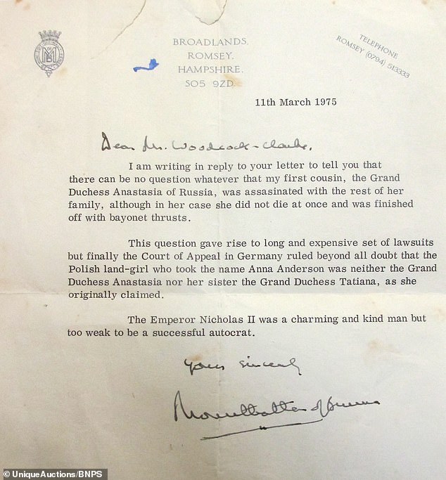 Лорд Маунтбеттен II Николай хааны охин Анастасия гэр бүлийг нь буудан хороосны дараа амьд үлдсэн гэх таамгийг үгүйсгэсэн байна. Тэрээр “Оросын гүнж, миний үеэл Анастасия гэр бүлийнхээ гишүүдийн хамтаар хөнөөгдсөн гэдэгт ямар нэгэн эргэлзээ байхгүй. Гэхдээ тэрээр шууд үхээгүй бөгөөд түүнийг жадаар хороосон. Энэ асуудал урт хугацаанд, өндөр зардалтай шүүхийн маргаан дагуулсан бөгөөд эцсийн эцэст Германы давж заалдах шүүх Анна Андерсон гэгч Польшийн тариаланч өөрийнх нь баталж буй шиг гүнж Анастасия ч биш, гүнж Татьяна ч биш болохыг эргэлзээгүй тогтоосон гэж захидалдаа бичжээ.
