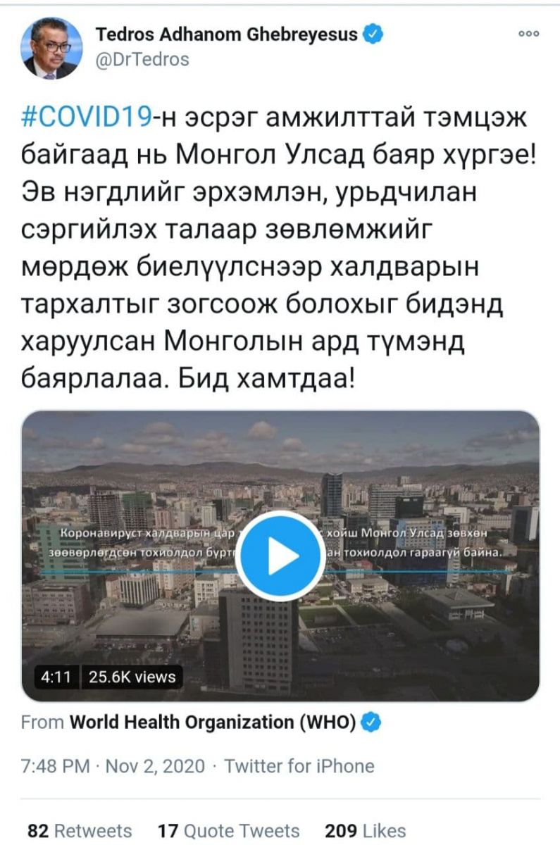 ДЭМБ-ын Ерөнхий захирал Др Тедрос Адханом Гебрейсус баримтат кино бүтээсэнтэй холбогдуулан "COVID19-ын эсрэг амжилттай тэмцэж байгаад нь Монгол Улсад баяр хүргэе! Эв нэгдлийг эрхэмлэн, урьдчилан сэргийлэх талаар зөвлөмжийг мөрдөж биелүүлснээр халдварын тархалтыг зогсоож болохыг бидэнд харуулсан Монголын ард түмэнд баярлалаа. Бид хамтдаа" хэмээн сэтгэгдлээ хуваалцжээ.