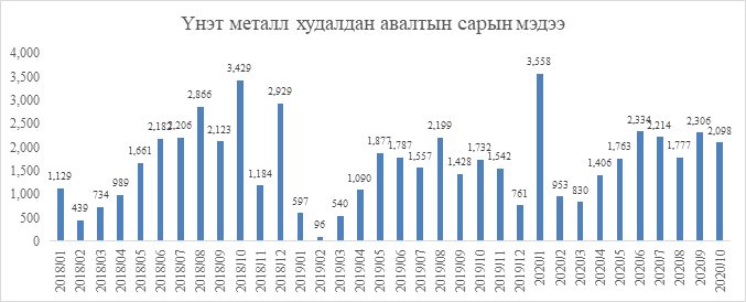Монголбанк аравдугаар сард 2.1 тонн үнэт металл худалдан авч, оны эхнээс өссөн дүнгээр нийт 19.2 тонн үнэт металл худалдан аваад байна. Энэ нь өмнөх оны мөн үетэй харьцуулбал 6.3 тонноор өссөн үзүүлэлт юм. Монголбанкны нийт худалдан авсан 19.2 тонн үнэт металлын 17.5 тонн нь алт, 1.7 тонн нь цагаан мөнгө байна.