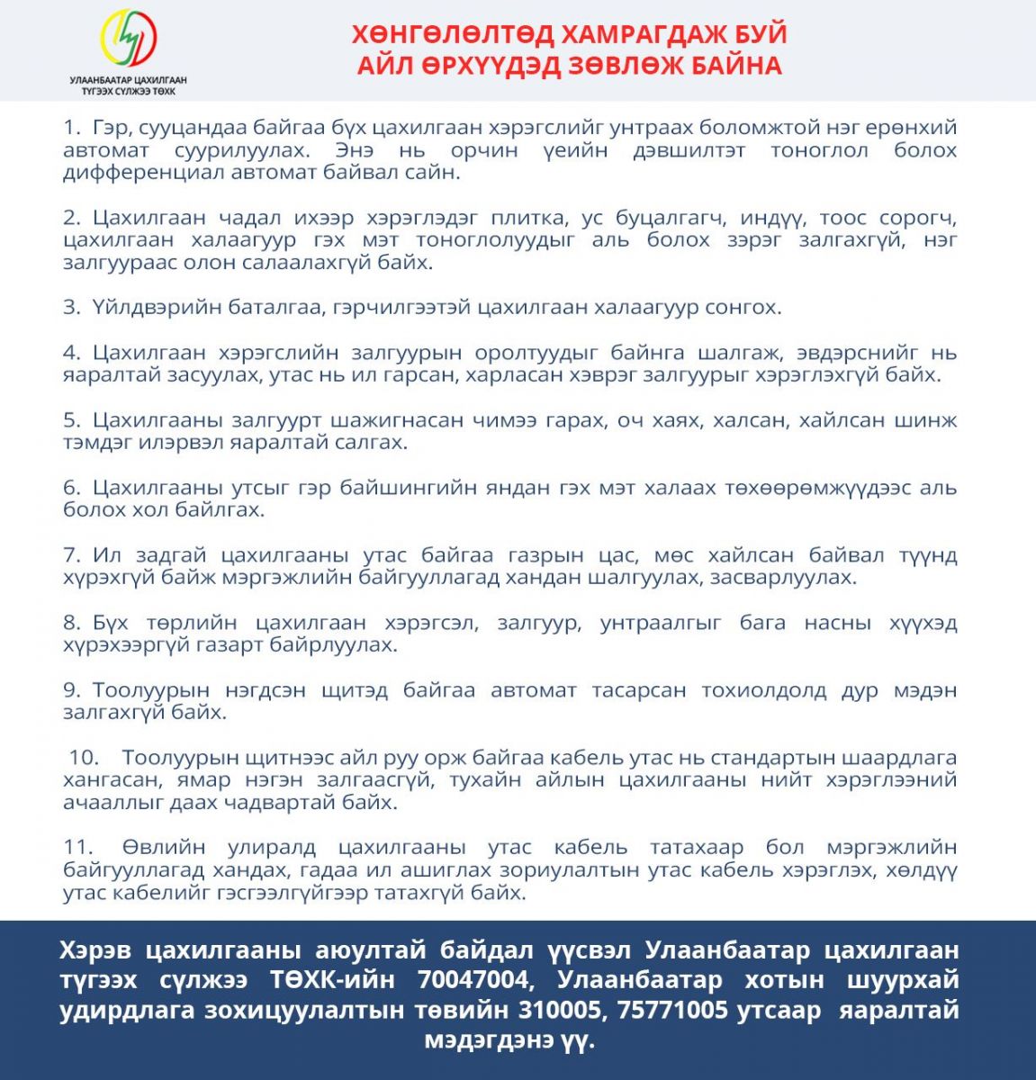 Хөнгөлөлтийг УБЦТС ТӨХК-тай цахилгаанаар хангах гэрээтэй гэр хорооллын бүх айл өрх шууд эдэлж эхлэх ба Цахилгааны шөнийн тарифын хөнгөлөлтөд хамрагдах айл өрхүүдэд дараах зөвлөмжийг хүргэж байна.