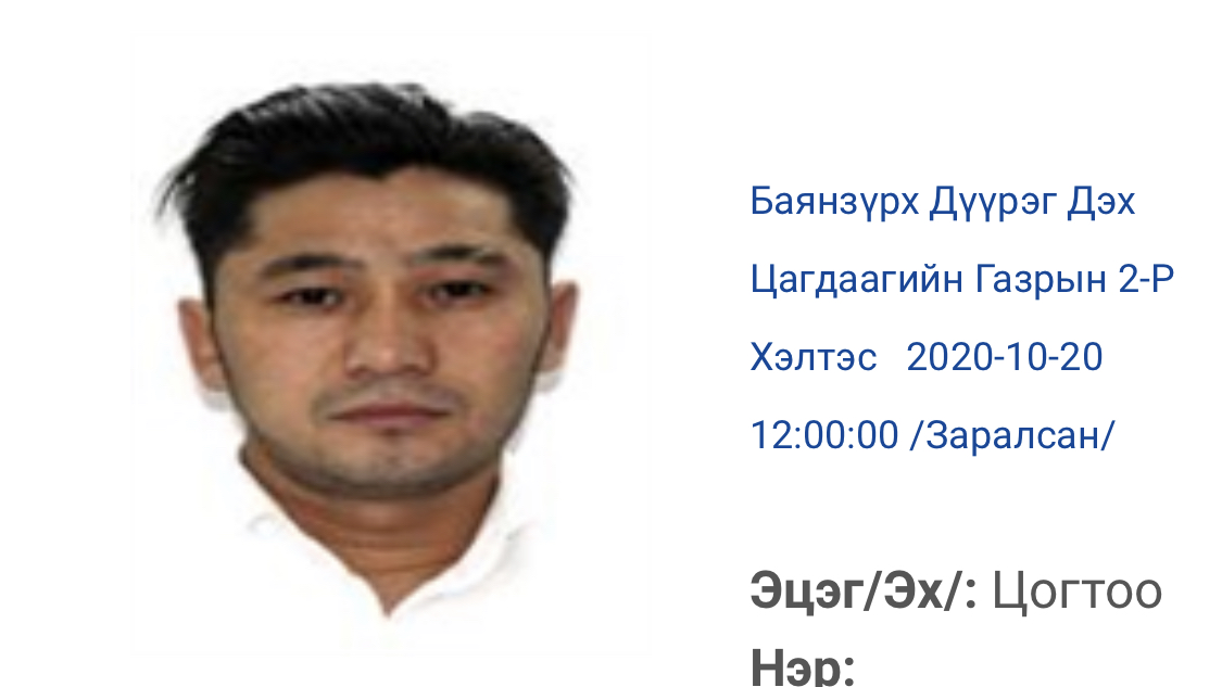 Түүнийг Чингэлтэй дүүргийн шүүхээс даалгасны дагуу аравдугаар сарын 20-ны өдөр нийслэлийн Баянзүрх дүүрэг дэх цагдаагийн хоёрдугаар хэлтсээс эрэн сурвалжилж эхэлжээ. Учир нь түүнийг 2014 онд байгуулсан гэрээний үүргээ биелүүлээгүй учраас эрэн сурвалжилж, оршин суугаа газрыг тогтоох шаардлага үүссэн байна.