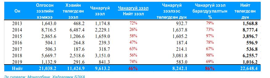 2019 оны эцсийн байдлаар 9.6 тэрбум төгрөгийн чанаргүй зээлээс 8.2 тэрбум төгрөгийг барагдуулж, чанаргүй зээл барагдуулалт 86 хувьтай байна. Харин тус хугацаанд барагдуулсан зээл, авлагын дүн нь 1.08 дахин өсөж, 22.6 тэрбум төгрөгийн төлбөр барагдуулжээ.