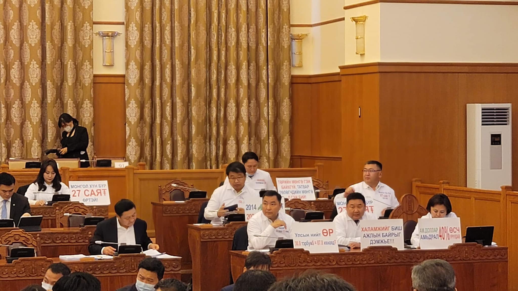 УИХ-ын нэгдсэн чуулганаар төсөв, мөнгөний бодлого хэлэлцэж байна. Энэ үеэр Ардчилсан намын бүлэг мөнгөний бодлогын алдааг эсэргүүцэж буйгаа илэрхийлж байна. Гишүүд “Монгол Улсын хүн бүр 27 сая төгрөгийн өртэй”, “Тэвчиж болох зардлаа тана”, “Төрийн мөнгө гэж байхгүй, татвар төлөгчдийн мөнгө гэж л бий” гэх зэргээр самбар өмнөө байрлуулжээ.