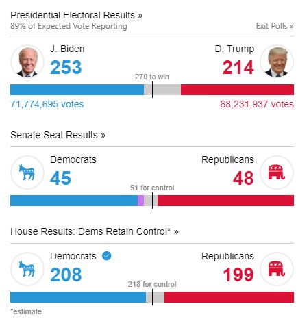 Цагаан ордны төлөө өрсөлдөж буй хоёр нэр дэвшигчийн сонгуулийн штаб өөр өөрсдийн нэр дэвшигч ялсан гэж мэдэгдэв. Нэр дэвшигчид ялалт байгуулахын тулд сонгогчдын коллегийн 538 гишүүний 270 санал авах ёстой. Хамгийн сүүлийн үеийн мэдээллээр, Бүгд Найрамдах намын нэр дэвшигч Доналд Трамп 214, Ардчилсан намын нэр дэвшигч Жозеф Байден 264 санал тус тус аваад байна.