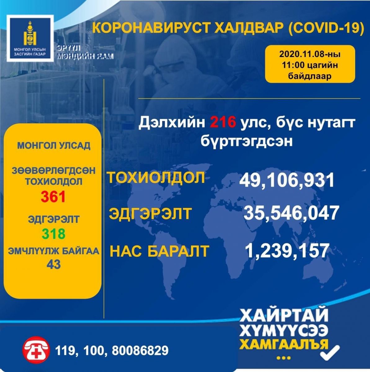 Эрүүл мэндийн яамнаас мэдээлснээр өнөөдрийн байдлаар (2020.11.08) коронавирусний халдвар нэмж дөрвөн хүнээс илрэн, нийт тохиолдлын (зөөвөрлөгдсөн0 тоо 361 болжээ.