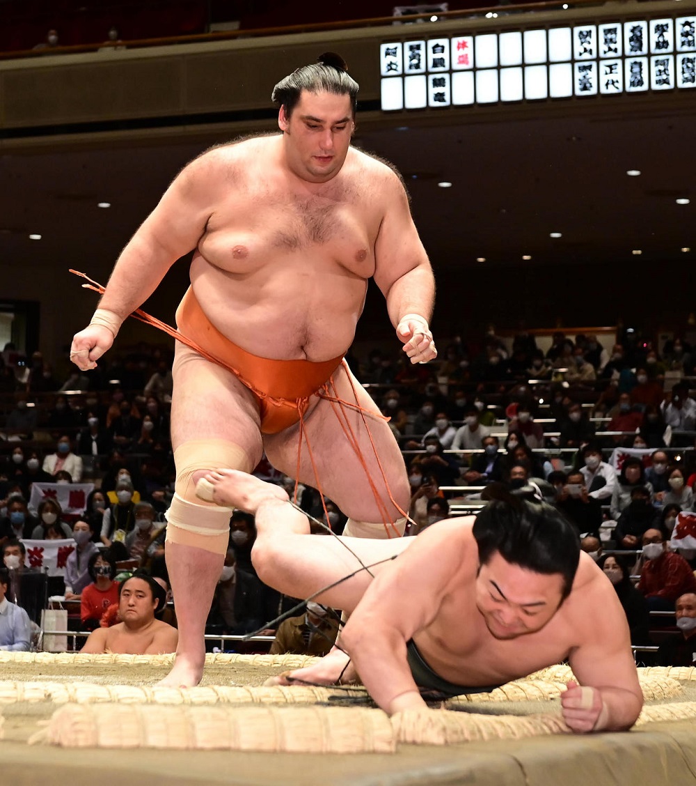 Миягино дэвжээний Энхо өөрөөсөө 100 кг хүнд Кайсэйтэй барилдахдаа тачиай дээр 2 метр өндөр бразил залуугийн мөрөнд хүртэл үсэрч, давуулан, мавашины барьц авах гэж оролдсон ч чадсангүй.