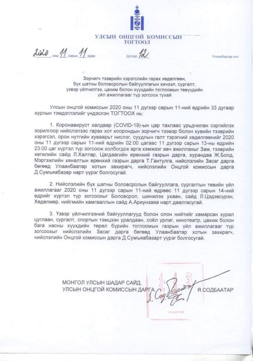 Мөн бүх шатны боловсролын байгууллагын үйл ажиллагааг арваннэгдүгээр сарын 11-14-ний өдрийг хүртэл түр зогсоох, үзвэр үйлчилгээний байгууллага болон олон нийтийг хамарсан үйл ажиллагааг хурал, цуглаан, тэмцээн уралдаан, урлаг соёл, кино теарт, цахим болон бага насны хүүхдийн тоглоомын газрын үйл ажиллагааг дээрх хугацаанд түр зогсоохыг даалгасан байна.