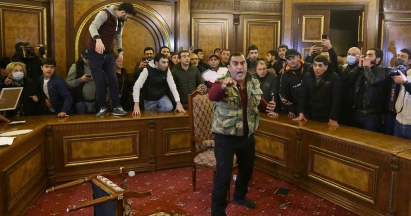 Түүнээс гадна, зарим жагсагчид Арменийн парламентын байр руу дайрч орон, хуралдааны танхимыг эзлээд: “Бид Никол Пашиняныг гарч ирэхийг шаардаж байна. Тийм хэлэлцээрт гарын үсэг зурах эрхийг хэн түүнд олгосон юм бэ” хэмээн чанга яригчаар хашгирсаар байсан аж. Мөн Арменийн парламентын дарга Арарат Мирзоян руу хэсэг жагсагчид дайран, балбаж зодсоны улмаас гэмтэн эмнэлэгт хүргэгдсэн байна.