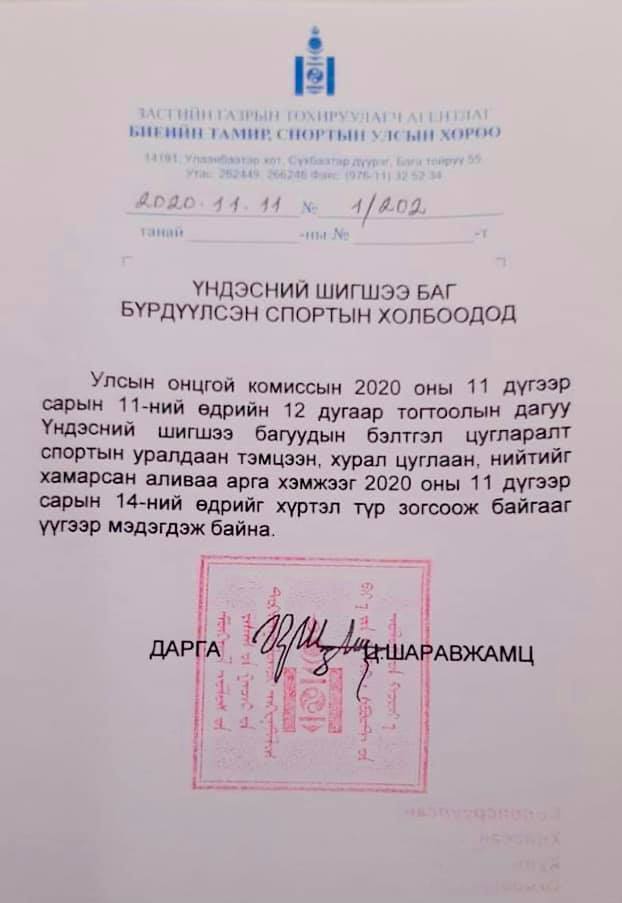 Биеийн тамир, спортын улсын хорооноос УОК-ын шийдвэртэй холбогдуулан, спортын бүхий тэмцээн уралдаан, шигшээ багийн цугларалт, бэлтгэл хийхийг хориглолоо.