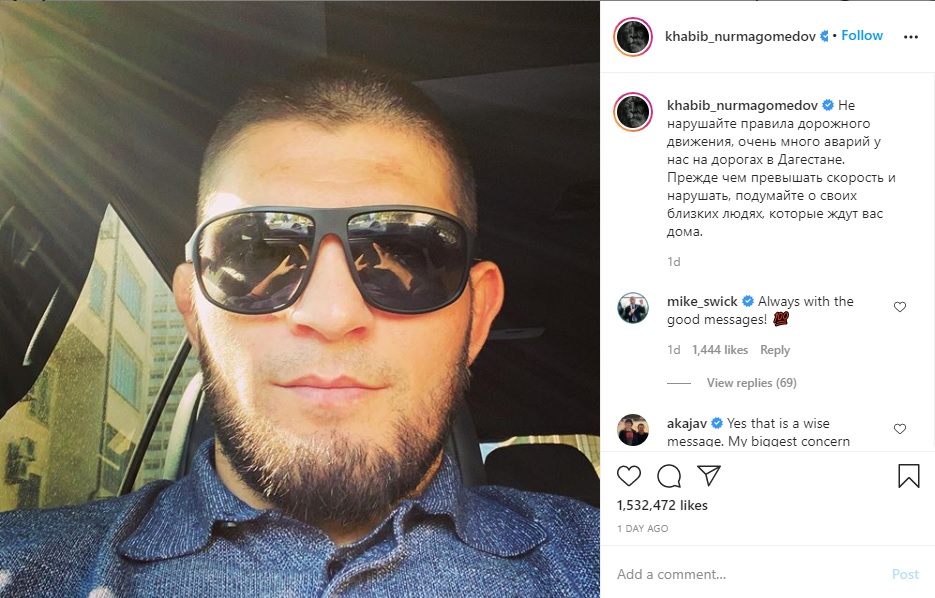 Холимог тулааны UFC холбооны хөнгөн жингийн аварга Хабиб Нурмагомедов инстаграм хуудсаараа дамжуулан, замын хөдөлгөөний дүрэм сахихыг уриаллаа.