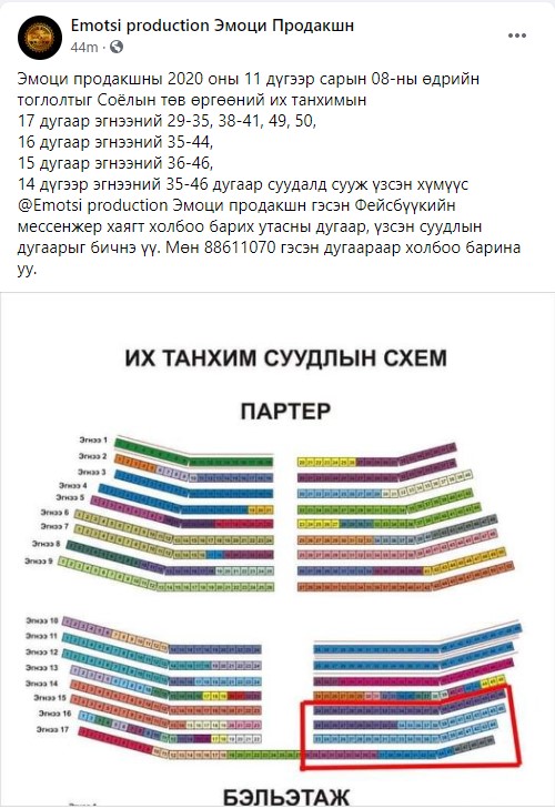 Дөнгөж сая “Эмоци” продакшн фейсбүүк хуудастаа тоглолт үзсэн хүмүүс ялангуяа 14-17 дугаар эгнээнд сууж байсан үзэгчдийг яаралтай холбоо барихыг хүссэн утгатай пост оруулсан байна.