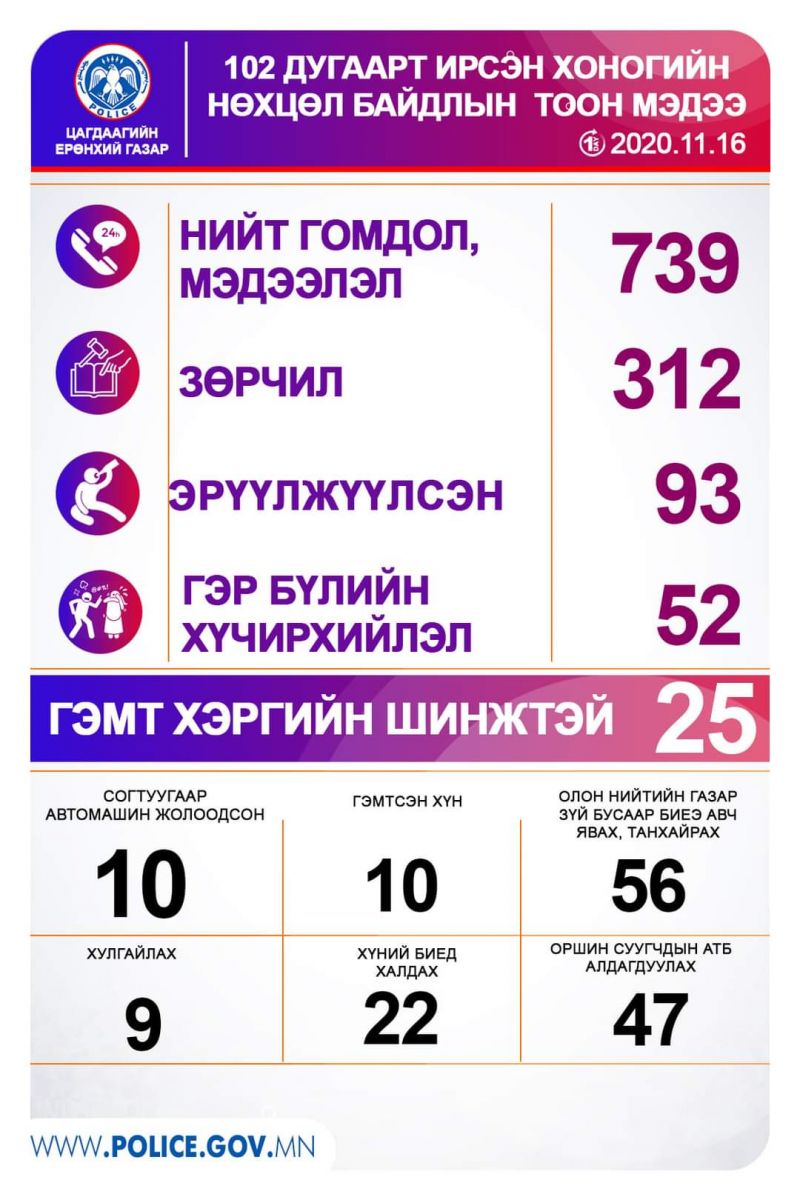 Өчигдөр нийт 739 гомдол мэдээлэл цагдаагийн 102 дугаарт иржээ. Үүнээс эрүүлжүүлсэн 93, зөрчил гаргасан 312, гэмт хэрэг 25, гэр бүлийн хүчирхийлэл 52 бүртгэгдсэн байна.