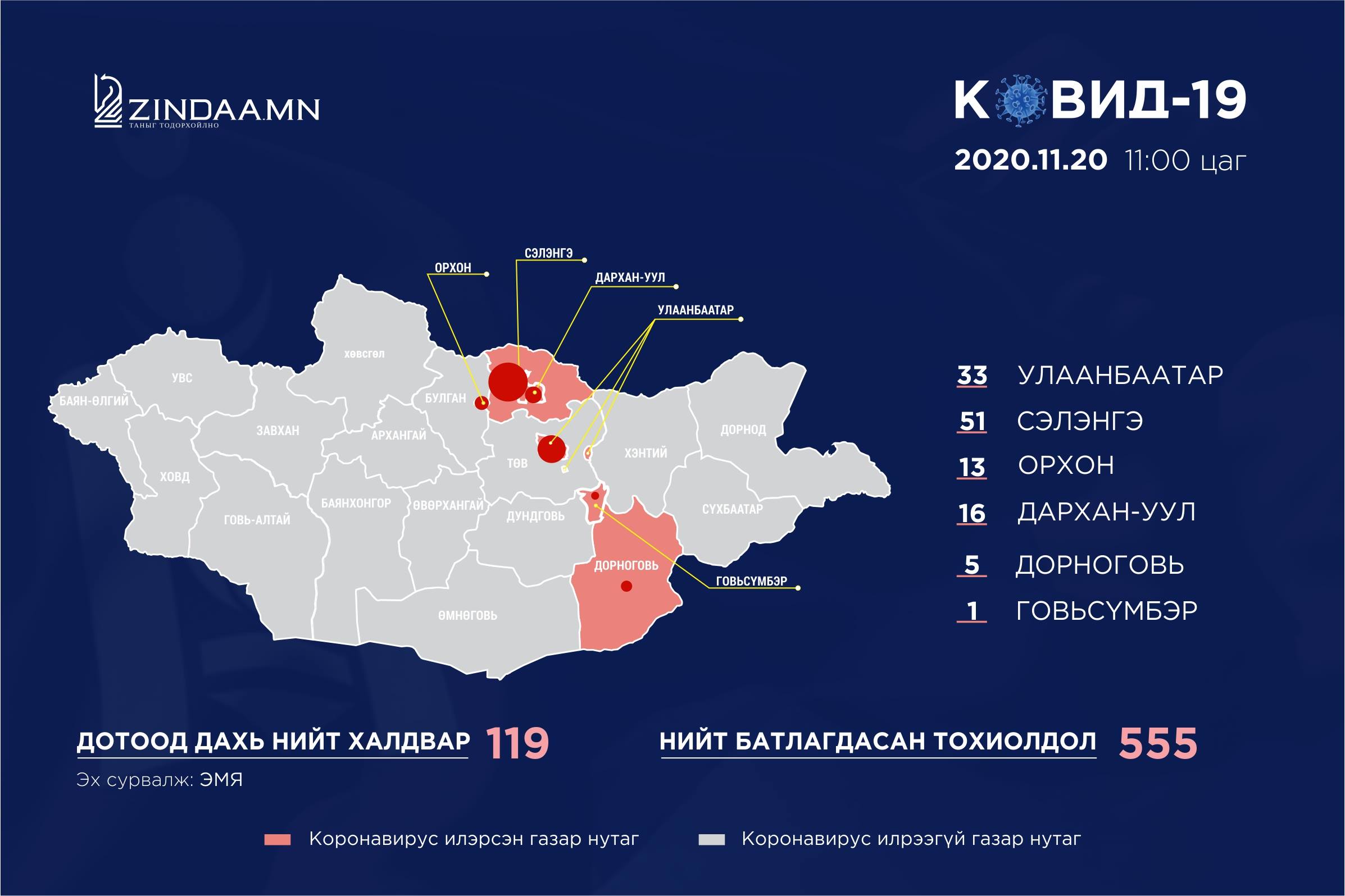 Харин Монгол Улсын хувьд халдвар авсан хүний тоо 555 боллоо. Энэ нь нийслэл Улаанбаатар болон таван аймагт кластер буюу багц хэлбэрээр өвчлөл бүртгэгдсэн байна. Нийслэл хотод өвчлөл гарсантай холбогдуулан ЗӨСҮТ-ийн эмч нар голомтын хоёр обектод 1299 мкв талбайд эцсийн халдваргүйтгэл хийсэн. Мөн тусгай дугаарын 119, 1800, 18002000 гэсэн утсуудад 4600 иргэн хандаж коронавируст халдвар болон эмнэлэгийн тусламж үйлчилгээтэй холбоотой зөвлөмжийг авсан байна. Эмнэлэг бол эрсдэлтэй орчин учраас иргэд аль болох эмнэлэгт очихоос татгалзаж, дээрх утсуудаар зөвлөмж зөвлөгөө авах нь ихсэж байгаад таатай байна" гэв.
