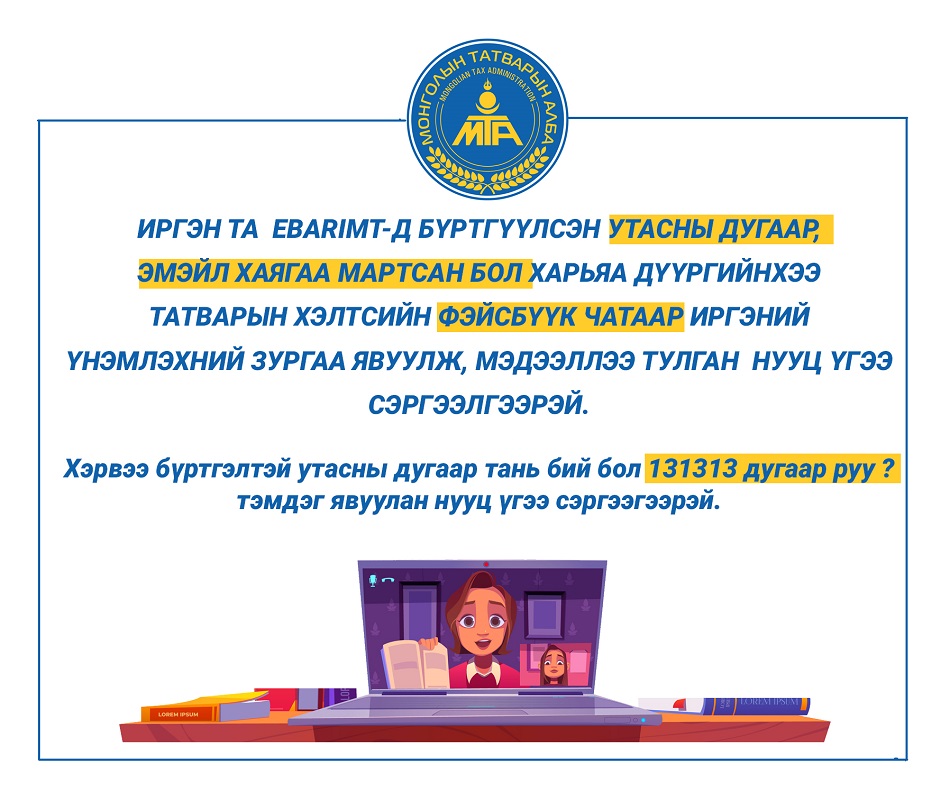 2. Иргэн та ebarimt-д бүртгүүлсэн утасны дугаар, эмэйл хаягаа мартсан бол харьяа дүүргийнхээ татварын хэлтсийн фэйсбүүк чатаар иргэний үнэмлэхний зургаа явуулж, мэдээллээ тулган нууц үгээ сэргээлгээрэй.