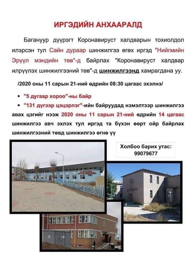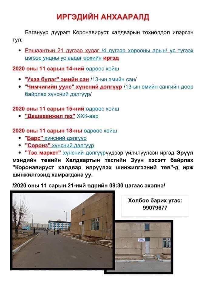 Сэжигтэй тохиолдол бүртгэгдсэн цагаас эхлэн бид хавьтлыг тодорхойлох бүх шаардлагатай арга хэмжээг авч ажиллаж байна. Халдвартай иргэний ойрын хавьтал болох 17, дам хавьтал болох 20, нийт 37 хүнээс түргэвчилсэн оношлуураар шинжилгээ авсан. Эхний байдлаар бүгд сөрөг гарсан. Дахин баталгаажуулах шинжилгээ хийнэ" гэсэн мэдээлэл хийсэн.