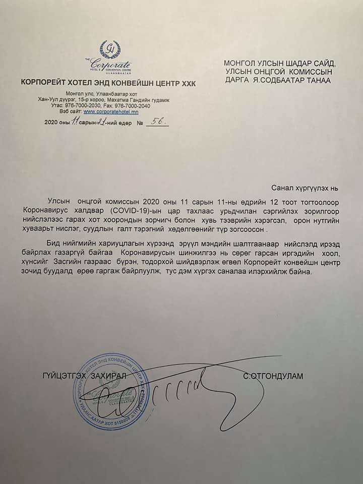 Үүнтэй холбоотойгоор “Корпорейт хотел энд Конвейшн центер” компанийн зүгээс нийслэл хотод ирээд, гэнэтийн хөл хорионд орсон иргэдийг байраар хангах боломжтой гэдгээ илэрхийлж, Монгол Улсын Шадар сайд, Улсын онцгой комиссын дарга Я.Содбаатарт хүсэлт хүргүүлжээ.