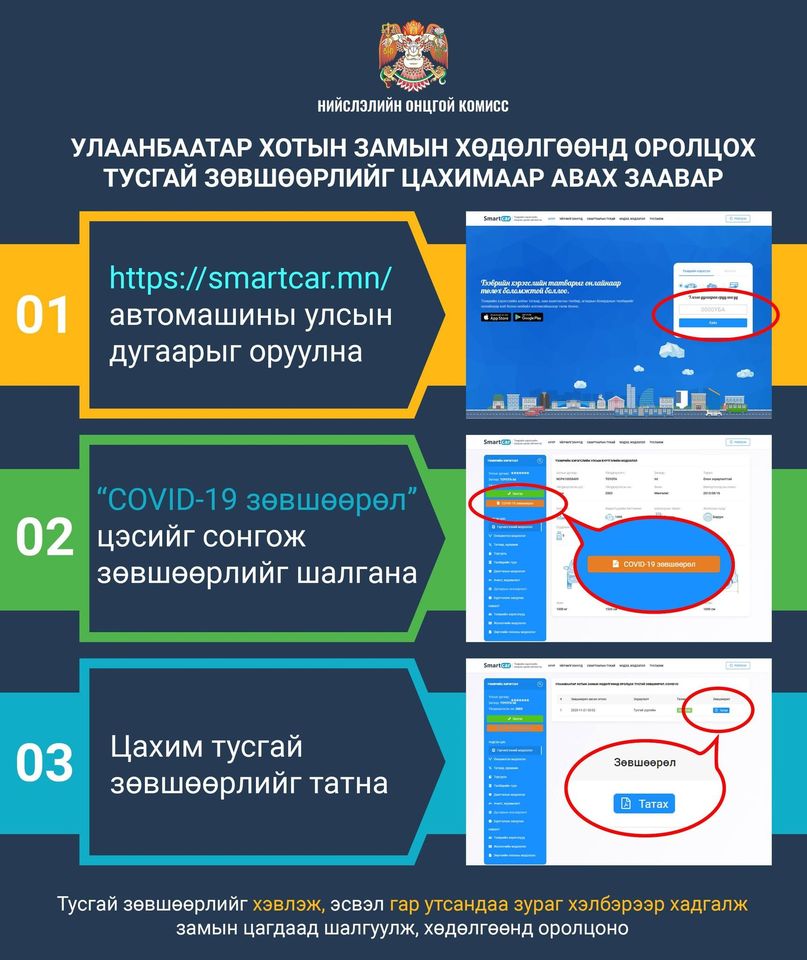 Мөн Улаанбаатар хот доторх автомашины хөдөлгөөнийг бууруулахын тулд зөвхөн дээрх 13 салбарын чиг үүргийг хэрэгжүүлэгч аж ахуйн нэгжийн албаны хэрэгцээний автомашинд QR код бүхий тусгай зөвшөөрөл олгох ажлыг нийслэлийн Замын хөдөлгөөний төлөвлөлт, зохицуулалт, инженерчлэлийн газраас зохион байгуулж байна.
