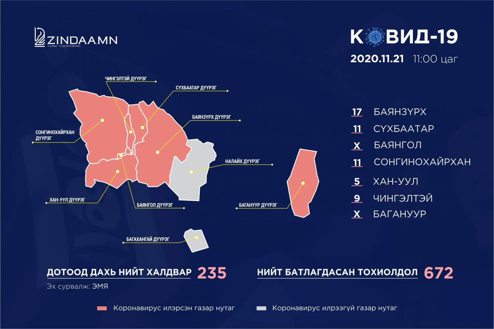 Монгол Улс коронавирусний халдварыг дотооддоо алдаж, улсын хэмжээнд хатуу хөл хорио тогтоогоод байна. Өнөөдрийн байдлаар Улаанбаатар хотоос гадна таван аймагт халдварын голомт батлагдаад байгаа юм. Тодруулбал, Улаанбаатар хотод 54, Сэлэнгэ аймагт 124, Дархан-Уул аймагт 20, Орхон аймагт 17, Дорноговь аймагт 14, Говьсүмбэр аймагт 3 тохиолдол тус тус батлагдаад байна.