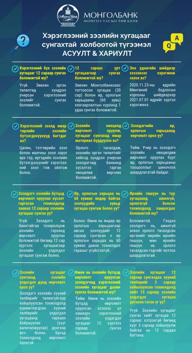-Мөнгөний бодлогын хорооны 2020 оны 8 дугаар сарын 7-ны өдөр гарсан шийдвэрийн хүрээнд Ковид-19 цар тахлын улмаас эргэн төлөлтөд хүндрэл учирсан зээлүүдийн хувьд үлдэгдэл хугацааг 12 хүртэлх сараар сунгах боломжтой байгаа. Тус шийдвэрийн хэрэгжилт 2020 оны 12 дугаар сарын 31-ний өдрийг дуустал үргэлжлэх байсныг 2021 оны 7-р сарын 1 өдрийг хүртэл сунгасан. Тиймээс одоо ч хэрэгжээд явж байгаа, ирэх оны 7 сарын 1-ний өдөр хүртэл хэрэгжих арга хэмжээ гэж ойлгож болно.