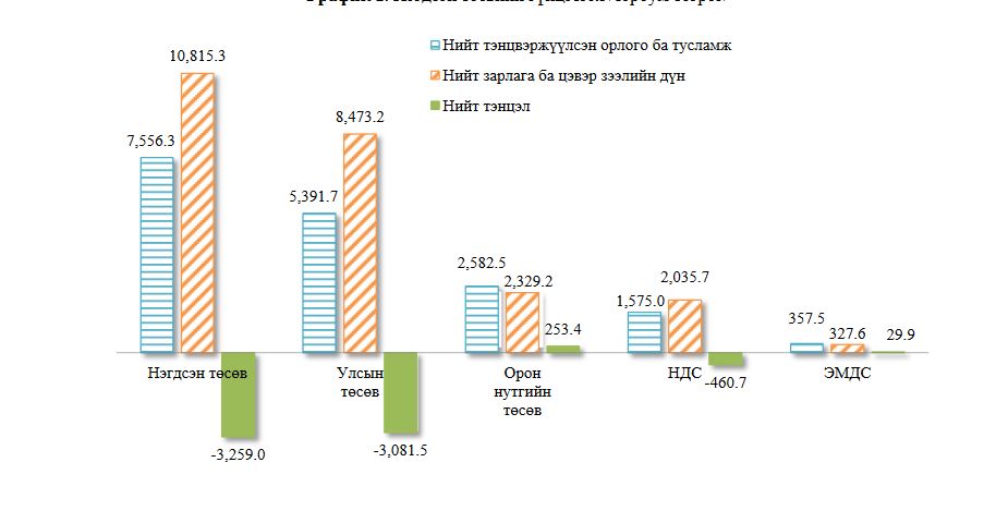 Төсвийн тэнцвэржүүлсэн тэнцлийн алдагдал өмнөх оны мөн үеэс 3,804.4 тэрбум төгрөгөөр нэмэгдсэн бол төлөвлөсөн дүнгээс 1,749.3 тэрбум төгрөгөөр буурчээ.