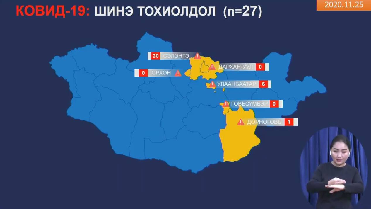 2020.11.24-ний 11:00 цагаас хойш ХӨСҮТ, Сэлэнгэ, Дархан, Орхон, Дорнод лабораториудад 3301 хүнд PCR шинжилгээ хийхэд Улаанбаатарт 6 (Нийт 60), Сэлэнгэ аймагт 20 (Нийт 144), Дорноговь аймгийн Айраг суманд 1 (Нийт 18 ), улсын хэмжээнд нийт 27 тохиолдол нэмж бүртгэгдлээ.
