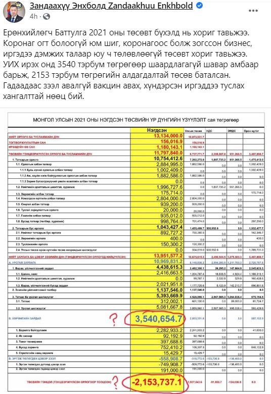 Харин Ерөнхийлөгчийн Тамгын газрын дарга асан З.Энхболд "Ерөнхийлөгч Баттулга 2021 оны төсөвт бүхэлд нь хориг тавьжээ. Коронаг огт болоогүй юм шиг, коронагоос болж зогссон бизнес, иргэдээ дэмжих талаар юу ч төлөвлөөгүй төсөвт хориг тавьжээ. УИХ ирэх онд 3540 тэрбум төгрөгөөр шаардлагагүй шавар амбаар барьж, 2153 тэрбум төгрөгийн алдагдалтай төсөв баталсан. Гадаадаас зээл авалгүй вакцин авах, хүндэрсэн иргэддээ туслах хангалттай нөөц бий" хэмээжээ.