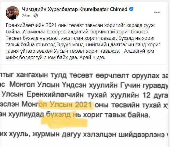 Сангийн сайд Ч.Хүрэлбаатар "Ерөнхийлөгчийн 2021 оны төсөвт тавьсан хоригийг хараад сууж байна. Уламжлал ёсоороо алдаатай, зөрчилтэй хориг болжээ. Төсөвт бүхэлд нь эсвэл, хэсэгчлэн хориг тавьдаг. Бүхэлд нь хориг тавьж байна гэчихээд Эрүүл мэнд, нийгмийн даатгалын санд хориг тавихгүйгээр зөвхөн Улсын төсөвт хориг тавьжээ. Алдаагүй юм хийж болдоггүй л юм байх даа. Арай ч дээ" хэмээн бухимдав.