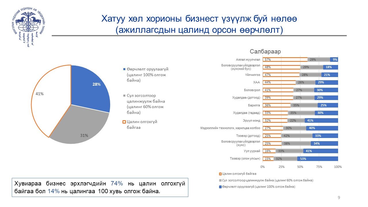 Засгийн газар, Улсын онцгой комисс коронавирусний дотоод дахь халдварын тархалтыг хумихын тулд хатуу хөл хорио тогтоосон шийдвэрийн хүрээнд бизнес эрхлэгчдийн 82 хувь бүрэн зогсолт хийсэн гэсэн судалгаа гараад буй.