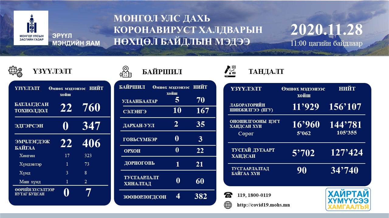 ЭМЯ-аас коронавируст халдварын нөхцөл байдлын мэдээллийг хүргэж байна /2020.11.28, 11:00 цаг/