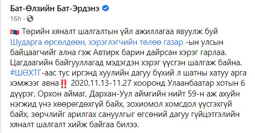 Энэ талаар тус газрын дарга Б.Бат-Эрдэнэ "Төрийн хяналт шалгалтын үйл ажиллагаа явуулж буй Шударга өрсөлдөөн, хэрэглэгчийн төлөө газар-ын улсын байцаагчийг ална гэж халив барин дайрсан хэрэг гарлаа. Цагдаагийн байгууллагад мэдэгдэн хэрэг үүсгэн шалгаж байна. ШӨХТГ-аас тус иргэнд хуулийн дагуу бүхий л шатны хатуу арга хэмжээг авна. 2020.11.13-11.27 хооронд Улаанбаатар хотын 6 дүүрэг, Орхон аймаг, Дархан-Уул аймгийн нийт 59-н аж ахуйн нэгжид үнэ хөөрөгдөхгүй байх, зохиомол хомсдол үүсгэхгүй байх, зөрчлийг арилгах сануулгыг өгсөний дагуу гүйцэтгэлийн хяналт шалгалт хийж байгаа билээ" гэж байр сууриа илэрхийлэв.