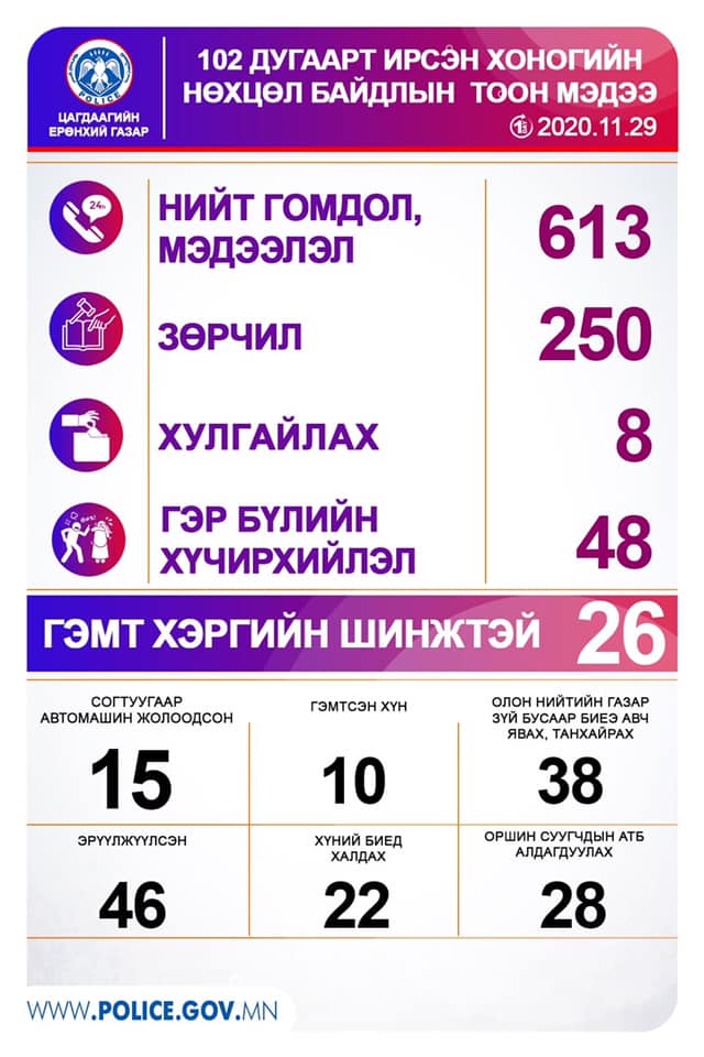Цагдаагийн байгууллагад өнгөрсөн хоногт нийт 613 дуудлага, мэдээлэл бүртгэгджээ. Үүнээс гэмт хэргийн шинжтэй 26 дуудлага байна. Харин гэр бүлийн хүчирхийллийн шинж чанартай 48, хулгайн найман хэрэг бүртгэгджээ. Түүнчлэн согтуугаар тээврийн хэрэгсэл жолоодсон 15 иргэнийг саатуулж, 46 хүнийг эрүүлжүүлэх байранд хүргэж, хонуулжээ.