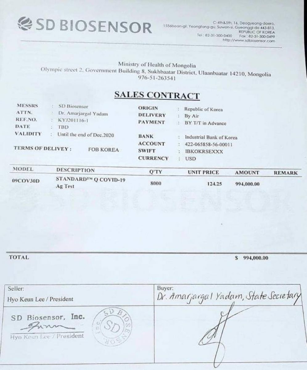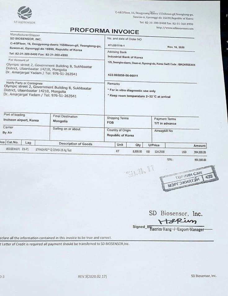 Эрүүл мэндийн яам нь БНСУ-аас Дэлхийн Эрүүл мэндийн байгууллагад хүлээн зөвшөөрөгдсөн, чанар стандартыг хангасан оношлуурыг захиалан, ашиглаж байна. Тус оношлуур нь нэг хайрцагтаа 24 ширхэг бөгөөд 124.25 ам. долларын өртөгтэй юм. Нэг ширхэг оношлуур 4.9 ам.доллар болж байгаа юм. ЭМЯ-аас тус оношлуурыг ард иргэдээ шинжилгээнд хамруулах зорилгоор 8 мянган хайрцагийг захиалан, ашиглаж байна. Түүнчлэн ДЭМБ-аас бүртгээгүй, чанарын шаардлага хангаагүй оношлуур, хэрэгслийг Монгол Улсын Эрүүл мэндийн яам аваагүй болохыг албан ёсоор мэдэгдье.