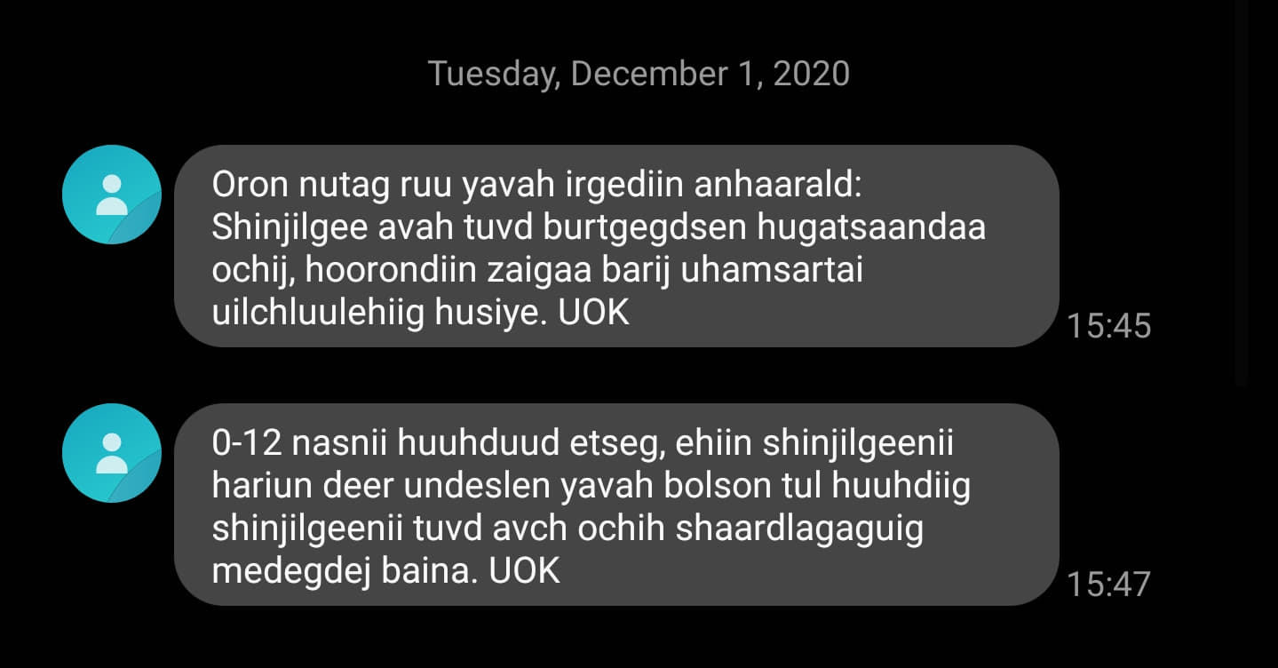 Энэ тухай Улсын Онцгой комиссоос иргэдийн гар утсанд мессежээр мэдээлж эхлээд байна.