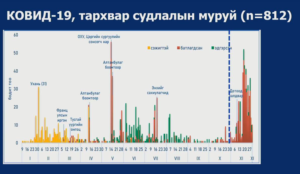 Өнөөдрийн байдлаар (2020.12.02) Монгол Улсад нийт батлагдсан тохиолдол 812 боллоо. Одоогоор улсын хэмжээнд 445 батлагдсан тохиолдол эмнэлэгт хэвтэн эмчлүүлж байна.