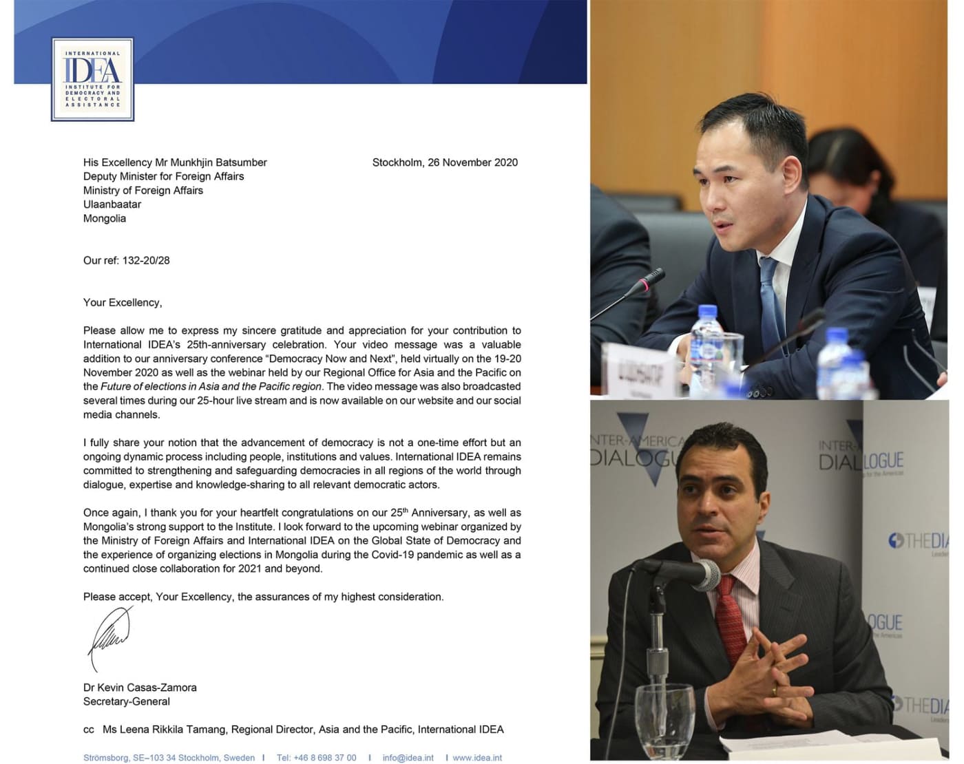 Кевин Касас Замора нь захидалдаа “Ардчиллыг тэтгэн хөгжүүлэх үйл хэрэг нь нэг удаагийн хүчин чармайлт бус харин иргэд, ардчиллын институт, үнэт зүйлсийг багтаасан байнгын идэвхтэй үйл явц болохыг тэмдэглэснийг тань олзуурхан талархаж байна. Бидний 25 жилийн ойд чин сэтгэлийн баяр хүргэсэн танд болон манай хүрээлэнг тууштай дэмжиж ирсэн Монгол улсад талархаж байгаагаа илэрхийлье” хэмээн бичжээ. Мөн захидалд Монгол улсын Гадаад Харилцааны Яам, Ардчилал, сонгуульд дэмжлэг үзүүлэх олон улсын хүрээлэн хамтарч “Дэлхийн ардчиллын төлөв байдал ба Ковид-19 цар тахлын үеийн Монгол улсын сонгуулийн туршлага” сэдвээр цахим хэлэлцүүлгийг зохион байгуулах гэж буй тухайгаа дурьдсан байна. Олон улсад нэр хүндтэй тус байгууллага нь эгнээндээ гучин гурван гишүүн орныг нэгтгэсэн ардчилал, сонгуульд дэмжлэг үзүүлэх зорилго бүхий засгийн газар хоорондын олон улсын байгууллага юм.