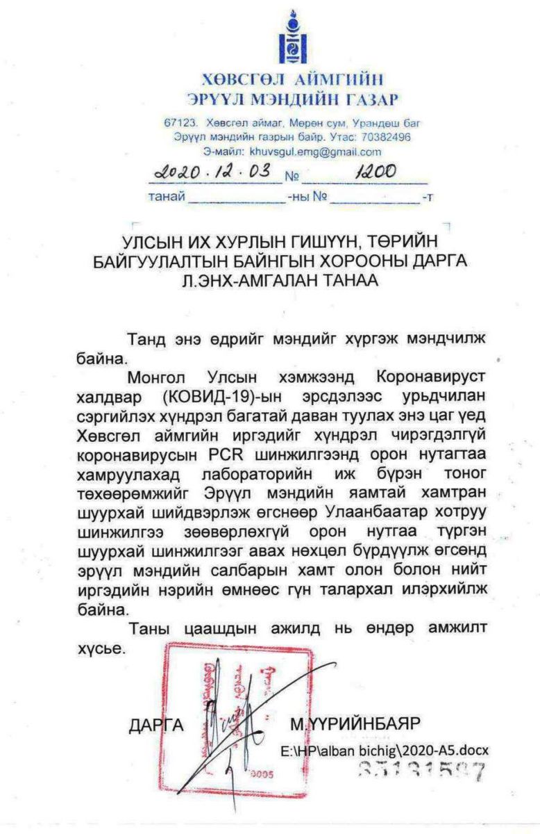Энэ талаар тус аймгаас сонгогдсон УИХ-ын гишүүн Л.Энх-Амгалан "2020 оны 11 дүгээр сарын 23-ны өдөр Хөвсгөл аймагт корона вирусын эрсдэлтэй тохиолдол бүртгэгдлээ гэсэн мэдээлэл гарч хоёр иргэний шинжилгээг Улаанбаатар хот руу явуулж цаг алдсан. Энэ хооронд иргэд маш их айдас түгшүүрт автсан. Миний бие Эрүүл мэндийн яаманд асуудлыг тавьж Хөвсгөл аймагтаа PCR шинжилгээ хийх боломжийг бүрдүүлж, 400 сая төгрөгийн өртөгтэй тоног төхөөрөмжийг хүргүүллээ. Өрх бүр элэг бүтэн байх болтугай... элэг бүтэн хөвсгөлчүүд хөтөлбөр." гэсэн мэдээллийг цахим хуудсаараа өглөө. Мөн Хөвсгөл аймгийн Эрүүл мэндийн газраас Л.Энх-Амглан гишүүнд талархлын албан бичиг ирүүлжжээ.