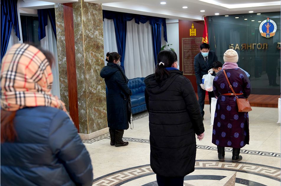 Дүүргийн удирдлагууд энэ удаа 1, 2, 4, 5 дугаар хорооны 14 иргэнд хүнсний багцыг гардуулсан бол орон нутгийн харьяалалтай зорилтот бүлгийн бусад өрх, иргэдэд “КОВИД-19” цар тахлаас сэргийлэх эрүүл ахуй, халдвар хамгааллын горимыг бүрэн сахиж, хороодоор дамжуулан хүргэхээр шийдвэрлэлээ. Олон улсын шилжилт хөдөлгөөний байгууллага ХНХЯ-ны хүсэлтээр, Нийслэлийн засаг даргын Тамгын газартай хамтран есөн дүүргийн хаягийн бүртгэлгүй 1000 иргэнд уг тусламжийг олгож эхэлсэн юм.