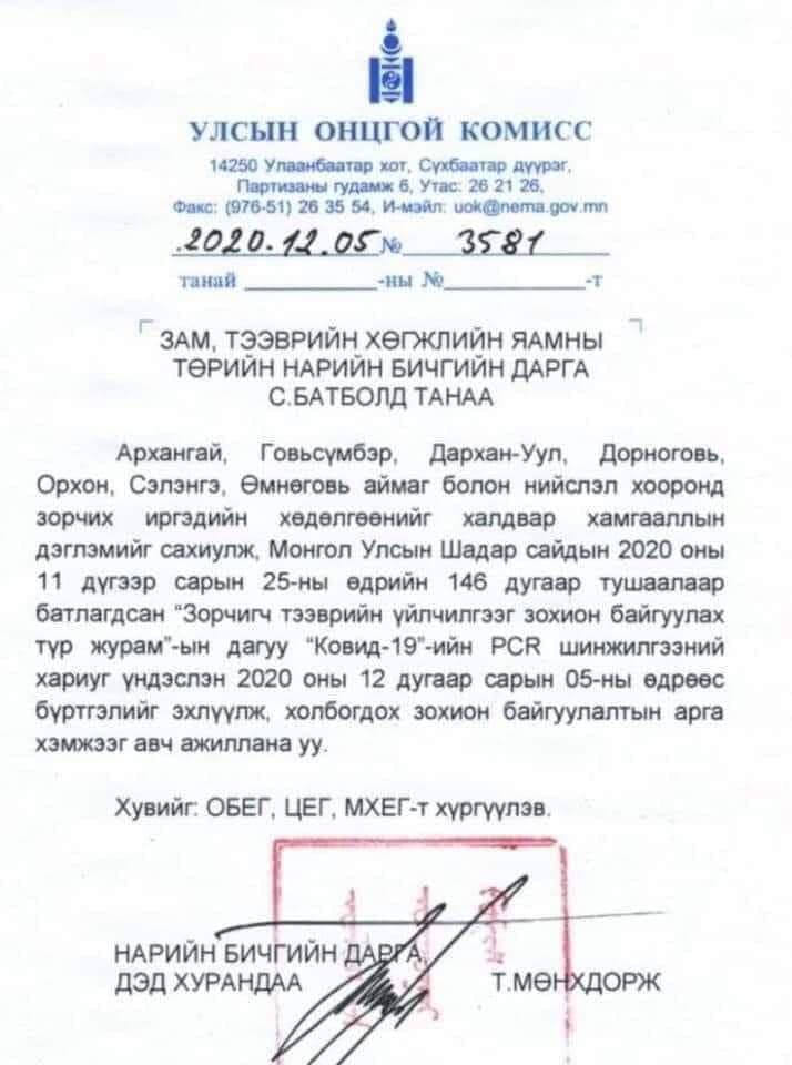 Тодруулбал, одоогоор коронавирусний халдвар бүртгэгдсэн Архангай, Говьсүмбэр, Дархан-Уул, Дорноговь, Орхон, Сэлэнгэ аймаг болон халдвар бүртгэгдээгүй стратегийн ач холбогдол бүхий Өмнөговь аймаг руу зорчих иргэдийг халдвар хамгааллын дэглэмж сахиулан, PCR шинжилгээнийн хариуг үндэслэн өнөөдрөөс бүртгэж, тээвэрлэлтийг зохион байгуулахыг холбогдох газруудад даалгажээ.