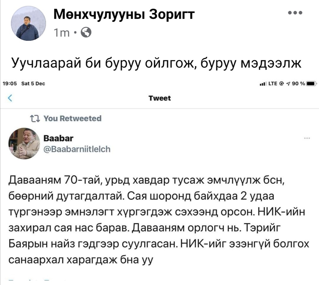 Хэсэг хугацааны дараа Д.Зоригт "Би буруу ойлгож, буруу бичсэн байна" гэсэн агуулгатай мэдээлэл сошл-д түгээгээд байна.