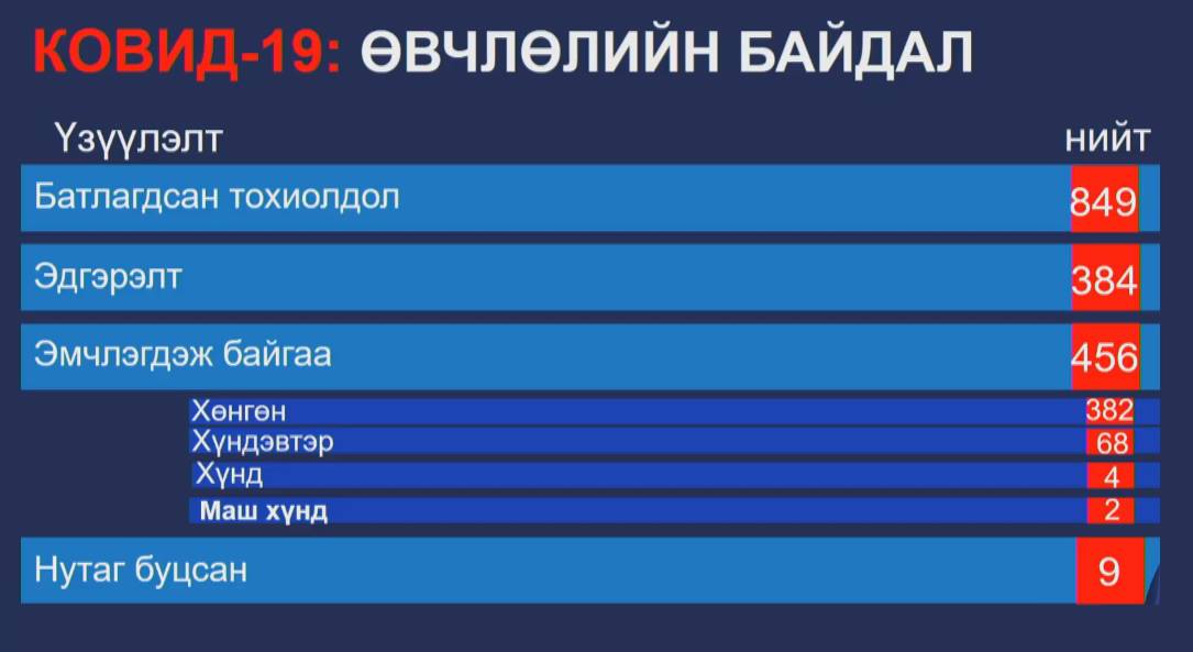 ХӨСҮТ-ийн Тандалт судалгааны албаны дарга А.Амбасэлмаа өвчтөнүүдийн биеийн байдал, эдгэрэлт, тандалт, нас байдлын талаар "Өчигдөр 16 хүн эдгэрч, дараагийн шатны хяналтад шилжсэн. Үүний 13 нь кластер голомтын хүмүүс байлаа. Тодруулбал, Улаанбаатар хотод халдвар авсан долоон хүн, Орхон аймгийн дөрөв, Сэлэнгэ аймгийн нэг, Дорноговь аймгийн нэг хүн голомтолсон халдвараас эдгэрч, дараагийн шатны хяналтад шилжсэн. ТИР машины жолооч нараас нэг, “Энхсаран” сувиллын голомтоос хоёр хүн эдгэрсэн. Улсын хэмжээнд 849 тохиолдол бүртгэгдээд байна. Үүнээс 384 буюу 45,2 хувь нь эдгэрлээ. Ажиглалт тандалтад 49, гэрийн тусгаарлалтад 13, ажиглалт тандалтын хугацаа дууссан 322, нутаг буцаасан есөн хүн байна. ХӨСҮТ, Цэргийн төв эмнэлэг, Сэлэнгэ аймгийн нэгдсэн эмнэлэгт 456 батлагдсан тохиолдол эмчлүүлж байна. Маш хүнд хоёр, хүнд дөрөв, хүндэвтэр 65, хөнгөн 382 тохиолдол эмчлүүлж байгаа. Цэргийн төв эмнэлэгт 206 хүн эмчилгээнд байна. Үүнээс маш хүнд хоёр хүн байгаа ба 56, 81 настай. Хүнд гурав, хүндэвтэр 41, хөнгөн 160. Сэлэнгэ аймагт зургаа хүн эмчлүүлж байгаа ба бүгд хөнгөн зэрэгтэй. ХӨСҮТ-д 244 хүн байна. Маш хүнд хүн байхгүй. Хүнд хүн нэг, бусад нь хүндэвтэр, хөнгөн зэргийн шинж тэмдэгтэй байна. Нийт батлагдсан тохиолдол дунд гурван сартайгаас эхлээд 91 насны өвчтөн байгаа. Үүнээс 0-15 насны 92 тохиолдол байна. 55-аас дээш насны 100 гаруй хүн бий. Тодруулбал, 80 настай хоёр, 81 настай нэг, 91 настай нэг хүн байна" гэсэн мэдээлэл өглөө.